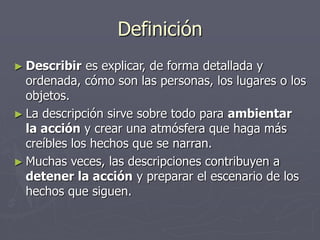 Este documento define la descripción y explica sus funciones y tipos. La descripción se usa para explicar personas, lugares u objetos de forma detallada. Puede tener funciones como introducir o concluir una acción, aumentar la intriga o servir como adorno. Existen descripciones objetivas e subjetivas, y tipos como topográficas, cronográficas y de personas. El lenguaje de la descripción incluye sustantivos, adjetivos, comparaciones y el tiempo presente o pretérito.