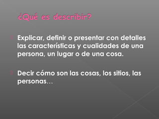 El documento describe los pasos para realizar un retrato o descripción detallada de una persona, lugar u objeto. Se recomienda observar atentamente para captar detalles importantes, describir rasgos físicos y de personalidad de manera ordenada, e incluir figuras retóricas para enriquecer la descripción.