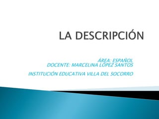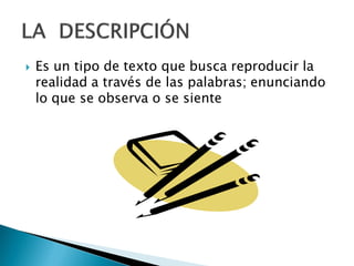 Este documento presenta diferentes tipos de descripción como la prosopografía, etopeya, retrato, autorretrato y caricatura para describir personas. También introduce la topografía para describir lugares, paisajes y ambientes. Explica que la descripción requiere observación, planificación y presentación de la información recolectada. Finalmente, ofrece consejos sobre cómo describir personas, lugares y objetos.