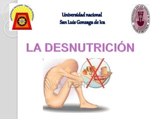 La desnutrición es una enfermedad causada por el insuficiente consumo de nutrientes, que puede resultar en graves problemas de salud, especialmente en niños. En Perú, se estima que casi 490 mil niños menores de dos años sufren de desnutrición crónica, y más de un millón padecen anemia por deficiencia de hierro. Se plantean diversas estrategias para combatir la desnutrición, incluyendo educación en nutrición, monitoreo del crecimiento infantil y un enfoque integral en los tratamientos médicos.