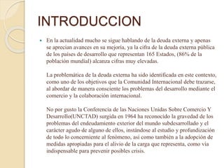 El documento trata sobre la deuda externa. Explica que la deuda externa de un país incluye la deuda pública contraída por el estado y la deuda privada contraída por particulares. Luego describe brevemente la crisis de la deuda en América Latina en los años 80, cuando muchos países no pudieron pagar sus deudas externas. Por último, presenta datos sobre la deuda externa de Colombia, la cual alcanzó los 109.280 millones de dólares en 2015, equivalente al 37,1% del PIB del país.
