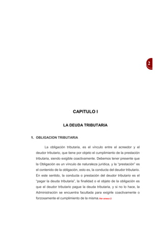 Este documento discute la deuda tributaria. Define la deuda tributaria como la suma adeudada al fisco constituida por el tributo, multas e intereses. Explica que la deuda tributaria puede estar compuesta por hasta cinco componentes: el tributo, intereses moratorios por pagos atrasados, multas por infracciones, intereses moratorios sobre multas, e intereses por facilidades de pago. También cubre temas como la transmisión de la obligación tributaria, los deudores tributarios, y las formas de extinción de la deuda como el pago