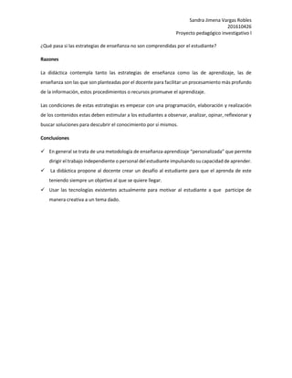 Este documento discute la importancia de la didáctica en la enseñanza. Argumenta que la didáctica involucra técnicas para facilitar el aprendizaje y que las estrategias de enseñanza deben ser comprendidas por los estudiantes para que sean efectivas. También identifica tres obstáculos al aprendizaje y concluye que la didáctica debe personalizar la enseñanza, desafiar a los estudiantes de manera apropiada, y usar tecnología para motivarlos.