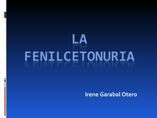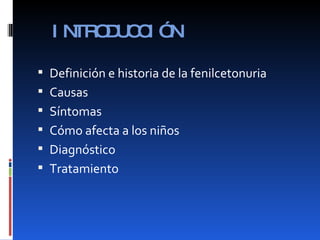 La fenilcetonuria es una enfermedad hereditaria rara que causa un déficit en la enzima fenilalanina hidroxilasa, lo que impide metabolizar adecuadamente el aminoácido fenilalanina. Si no se trata, puede causar retraso mental severo. Los síntomas incluyen microcefalia, temblores, retraso en el desarrollo y problemas de conducta. El diagnóstico se realiza mediante análisis de orina o sangre y el tratamiento consiste en una estricta dieta baja en fenilalanina