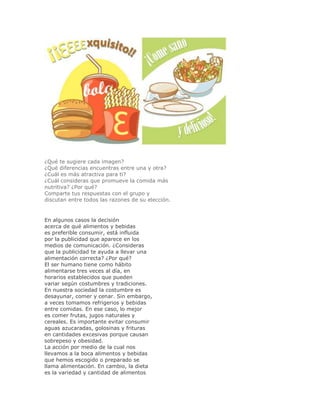 Una dieta correcta es importante para la salud y obtener la energía necesaria para las actividades diarias. La alimentación varía según los gustos y necesidades nutricionales de cada persona, así como su estilo de vida y cultura. Es importante saber qué constituye una dieta balanceada y cómo la publicidad puede influir en las decisiones sobre los alimentos consumidos.