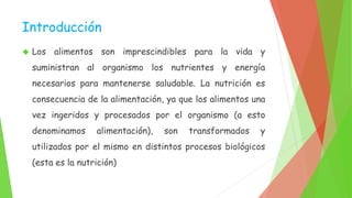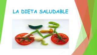 La dieta saludable proporciona los nutrientes necesarios para mantenerse saludable mediante una alimentación variada, equilibrada y adaptada a cada persona. Una dieta saludable incluye frutas, verduras, carnes, pescados, lácteos y cereales en cantidades moderadas, y evita los excesos de grasas, azúcares y sal. Cambiar hábitos como comer en familia, planear comidas y comer lentamente puede llevar a una alimentación más saludable.