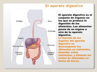 La digestión es el proceso por el cual los alimentos se descomponen en nutrientes a través de la digestión mecánica y química en varios órganos del aparato digestivo, incluyendo la boca, el estómago, el hígado, el páncreas y el intestino, para que el cuerpo pueda absorberlos y utilizarlos como energía, y los desechos se eliminan como heces.