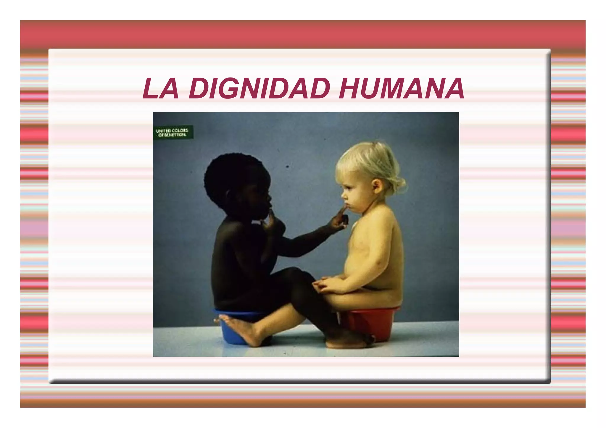 El documento describe los principios fundamentales de la dignidad humana, incluyendo la solidaridad, igualdad, derechos humanos y participación. Explica que cada persona es única e irrepetible y construye su vida en torno a valores como la fe, mientras madura con la ayuda de los demás. También destaca que la solidaridad y la igualdad son valores humanos esenciales, y que los derechos humanos deben defender la dignidad de todos los individuos.