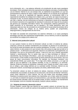 El documento discute la dimensión cultural de Internet. Señala que Internet no es solo una tecnología, sino también una producción cultural. Explica que la dimensión cultural, es decir, el sistema de valores y creencias, fue decisiva en el desarrollo de Internet como una herramienta de comunicación horizontal, global y libre. Identifica cuatro capas culturales clave en el origen y desarrollo de Internet: la universitaria, la de los hackers, las formas culturales alternativas y la empresarial.
