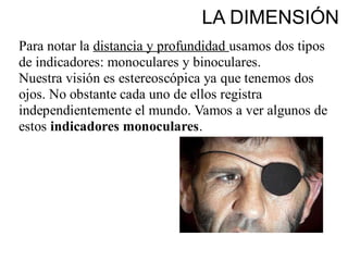 Este documento describe los diferentes mecanismos visuales y cognitivos que permiten la percepción de la profundidad y la distancia, incluyendo indicadores monoculares como el tamaño aparente, el paralaje de movimiento y la perspectiva, e indicadores binoculares como la convergencia visual y la disparidad retiniana. También explica las teorías de la Gestalt sobre cómo el cerebro organiza visualmente la información para formar figuras coherentes.