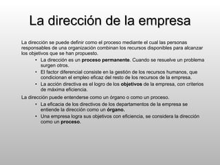 La dirección en la empresa implica combinar los recursos disponibles para alcanzar los objetivos propuestos mediante un proceso permanente. La dirección puede entenderse como un órgano o como un proceso. Las funciones de la dirección incluyen la planificación, organización, ejecución, coordinación, control y evaluación para lograr los objetivos de la empresa con eficiencia. La autoridad y el poder son necesarios para la dirección, pero también es importante la delegación de autoridad y el liderazgo.