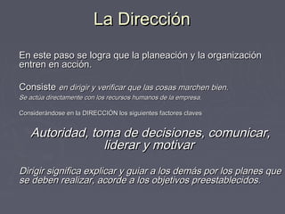 El documento describe los conceptos clave de la dirección. La dirección implica dirigir y verificar que los planes se lleven a cabo correctamente mediante la interacción directa con los recursos humanos de la empresa. Involucra factores como la autoridad, la toma de decisiones, la comunicación y la motivación. La dirección se ejerce en diferentes niveles de la organización para guiar a los grupos y asegurar el cumplimiento de los objetivos.