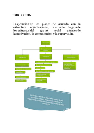 Este documento habla sobre la dirección dentro de una organización. Explica que la dirección implica ejecutar los planes de acuerdo a la estructura organizacional mediante la guía, motivación y supervisión de los esfuerzos del grupo. También discute conceptos como la toma de decisiones, comunicación, autoridad, reclutamiento, selección, capacitación y desarrollo del personal.