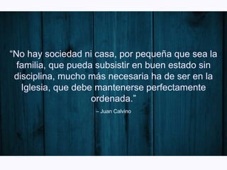 El documento aborda la importancia de la disciplina en la iglesia según Juan Calvino, destacando que es esencial para mantener el orden y el arrepentimiento. Se describen los grados de disciplina, desde la amonestación pública hasta la excomunión, y se enfatiza que la corrección debe hacerse con mansedumbre. Además, se subraya la responsabilidad del clero y la comunidad en el ejercicio de esta disciplina para evitar la profanación de la iglesia y promover el arrepentimiento.