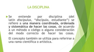 Este documento define la disciplina como una manera coordinada y sistemática de hacer las cosas de acuerdo a un método o código. Explica que existen diversos tipos de disciplina como la militar, escolar, laboral y autodisciplina. La disciplina militar se refiere a la fidelidad de las fuerzas armadas para proteger la nación. La disciplina escolar garantiza la continuidad de los saberes en instituciones educativas. La disciplina laboral distingue los asuntos laborales de los personales para asegurar un trabajo ordenado y eficaz.