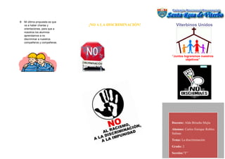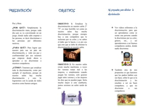 El documento propone que habrá charlas y orientaciones para que los estudiantes aprendan a no discriminar. También sugiere ver videos sobre discriminación y hablar con los padres para enseñar a los niños a ser buenos compañeros sin discriminar. Los objetivos son erradicar la discriminación en el salón, especialmente el machismo, para que todos sean buenos amigos en un salón unido y en paz.