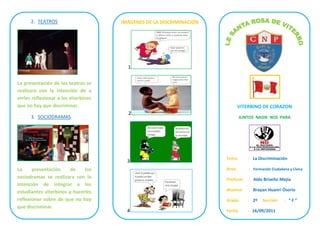 Este documento presenta un tríptico sobre la discriminación en la escuela Santa Rosa de Viterbo con el objetivo de reducir y eliminar la discriminación en el salón 2°F. Propone realizar teatros, sociodramas y charlas para crear conciencia sobre los efectos negativos de la discriminación y la importancia de la integración. El tríptico busca abordar este problema antes de que empeore y afecte el aprendizaje y bienestar de los estudiantes.