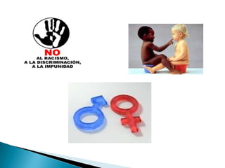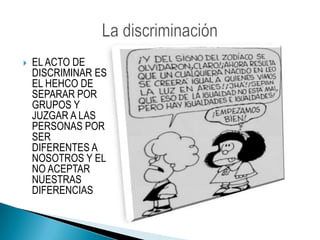 El documento habla sobre los diferentes tipos de discriminación, incluyendo la discriminación racial, sexual, religiosa, ideológica, social y laboral. Define la discriminación como el acto de separar y juzgar a las personas por ser diferentes y no aceptar sus diferencias. También discute cómo la discriminación afecta negativamente a grupos como los ancianos, enfermos y pobres en la sociedad actual.