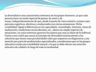 Este documento trata sobre la diversidad en los grupos humanos. Explica que cada persona es única y que existen diferencias naturales entre las personas en capacidades, intereses y ritmos de aprendizaje. Además, señala que la diversidad cultural debe valorarse tanto como la biodiversidad natural y que no se debe caer en explicaciones simplistas basadas en la biología para entender las culturas humanas.