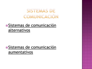 Este documento describe diferentes sistemas de comunicación alternativos y aumentativos. Se dividen en sistemas con ayuda, que utilizan pictogramas u ortografía, como el sistema Bliss, y sistemas sin ayuda, como la lengua de signos. Proporciona detalles sobre varios sistemas populares como el sistema Bliss, el sistema PEC y el alfabeto dactilológico.