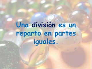 El documento explica los conceptos básicos de la división, incluyendo divisor, dividendo, cociente y resto. También muestra ejemplos de cómo realizar divisiones y comprobar los resultados mediante la multiplicación. Finalmente, presenta algunos problemas de división para practicar los conceptos.