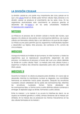 La división celular incluye la mitosis y la meiosis. La mitosis produce dos células hijas idénticas y ocurre en organismos multicelulares para el crecimiento y reparación de tejidos. La meiosis reduce la ploidía y produce gametos con la mitad de cromosomas, consistiendo de dos divisiones celulares seguidas de una sola replicación del ADN. Esto resulta en cuatro células hijas haploides. Ambos procesos involucran cinco etapas: interfase, profase, metafase, anafase y telof