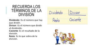 El documento explica el proceso para dividir números de dos cifras. Se describen los pasos: 1) tomar las cifras iniciales del dividendo, 2) dividir esa cifra entre el divisor y anotar el cociente, 3) multiplicar y restar para obtener el siguiente paso de la división. Se proveen ejemplos y enlaces a videos y actividades adicionales sobre el tema.