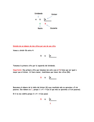 El documento explica cómo realizar divisiones. Define la división como calcular cuántas veces un número (dividendo) incluye a otro (divisor). Explica los términos de una división (dividendo, divisor, cociente, resto) y cómo realizar divisiones de números de una y dos cifras restando sucesivamente el resultado de multiplicar el divisor por el cociente. Indica que el resto puede ser cero si la división es exacta o un número menor que el divisor. Proporciona ejemplos para ilustrar el proceso.