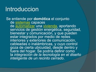 La domótica se refiere a los sistemas que automatizan una vivienda para proporcionar servicios de gestión energética, seguridad, confort y comunicación. Estos sistemas integran sensores, actuadores y una central de control conectados a través de redes internas y externas. La domótica permite ahorrar energía, mejorar el confort y la seguridad de una vivienda de forma automática y a distancia.