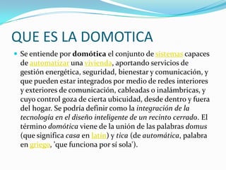 La domótica se refiere al conjunto de sistemas que automatizan una vivienda para proporcionar servicios de gestión energética, seguridad, confort y comunicación. Estos sistemas pueden estar integrados a través de redes internas y externas y ser controlados de forma ubicua desde dentro y fuera del hogar. La domótica ofrece servicios relacionados con el ahorro energético, confort, seguridad, comunicaciones y accesibilidad. Puede tener una arquitectura centralizada, con un controlador central, o distribuida, con
