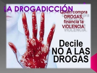 El documento discute las drogas y sus efectos. Define una droga como una sustancia que puede alterar el pensamiento, las sensaciones y las emociones de quien la consume, y cambiar su comportamiento y forma de ser a largo plazo. Explica que algunas drogas son legales e ilegales, pero que la legalidad de una droga solo regula su producción y venta y no significa que no sea peligrosa.