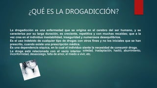 La drogadicción es una enfermedad del cerebro que causa dependencia psicológica y problemas físicos, psicológicos y sociales. Factores como la soledad, falta de oportunidades laborales y crisis vitales pueden llevar a los jóvenes a consumir drogas para escapar de la realidad. Las drogas son sustancias que alteran el sistema nervioso central y pueden causar daño si se abusan de ellas.