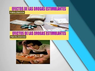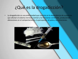 La drogadicción es una enfermedad que causa dependencia de sustancias que afectan el sistema nervioso central y producen alteraciones en el comportamiento, percepción, juicio y emociones. Las drogas pueden causar alucinaciones, cambios en los sentidos, euforia o desesperación e incluso llevar a la locura o muerte. La dependencia de drogas puede ser física o psíquica y las drogas se clasifican según sus efectos, con ejemplos como alucinógenos que causan cambios psicológicos y