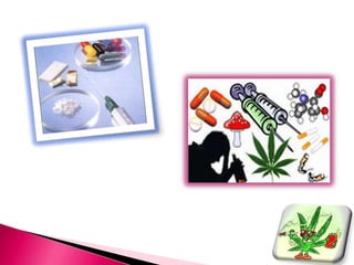 La drogadicción es una enfermedad causada por la adicción a sustancias tóxicas que afectan el sistema nervioso central y alteran el comportamiento. Las drogas comunes incluyen alcohol, heroína, anfetaminas, éxtasis, cocaína y ritalin, cada una con sus propios efectos dañinos como adicción, ansiedad, depresión, daño orgánico, e incluso la muerte. La drogadicción es un problema de salud pública que requiere un enfoque integral que incluya prevención, tratamiento