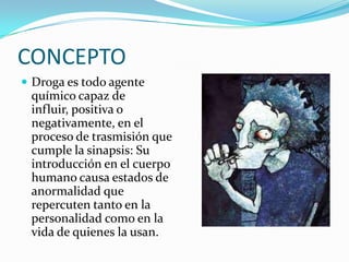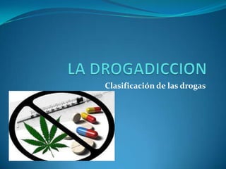 Este documento clasifica las drogas en cuatro categorías: narcóticos, que producen dependencia física y psicológica; sedantes, que deprimen y retardan las funciones del cuerpo; estimulantes, que aumentan la agudeza mental y actividad física; y alucinógenos, que afectan las percepciones y conciencia. Explica brevemente los efectos de cada categoría.