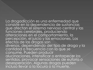 La drogadicción es una enfermedad que consiste en la dependencia de sustancias que afectan el sistema nervioso central y producen alteraciones en el comportamiento, la percepción y las emociones. Los efectos de las drogas varían dependiendo del tipo y cantidad consumida, e incluyen alucinaciones, cambios en los sentidos, euforia o desesperación, e incluso locura o muerte. Los trastornos asociados con la drogadicción incluyen problemas fisiológicos como síndrome de abstinencia y convulsiones, así como problemas