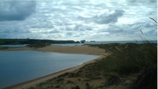 El Parque Natural de las Dunas de Liencres se encuentra en Cantabria y está formado por dunas móviles y fijas, playas y bosques de pino. Las dunas se crearon por la acción del viento y fueron fijadas con la plantación de pinos en 1949. El parque ofrece senderos para observar aves y vistas panorámicas de la costa.
