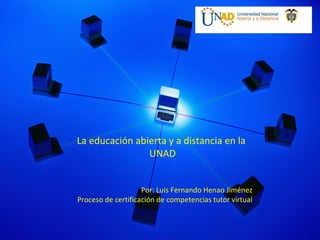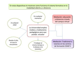 El documento describe el sistema formativo de la Universidad Abierta y a Distancia de Colombia (UNAD), el cual utiliza la educación a distancia a través de un campus virtual que permite estudiar en cualquier momento y lugar. La UNAD emplea medios pedagógicos como tutorías presenciales y virtuales para apoyar el aprendizaje autónomo de los estudiantes, el cual se desarrolla a través de tres fases: reconocimiento de conocimientos previos, profundización a través de análisis y comprensión de unidades didácticas, y