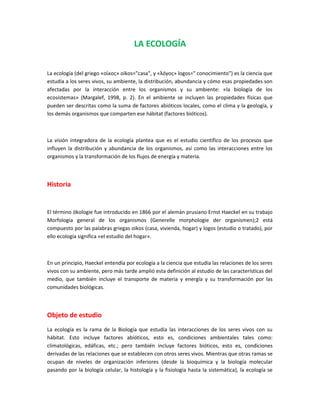 La ecología estudia las interacciones entre los organismos y su ambiente, incluyendo factores abióticos como el clima y la geología, y factores bióticos como las relaciones entre organismos. Analiza cómo estos factores afectan la distribución, abundancia y transformación de energía y materia entre organismos. Fue definida originalmente como el estudio de las relaciones entre organismos y su hábitat, pero la definición se amplió para incluir el estudio del transporte de energía y materia a través de comunidades biológicas.