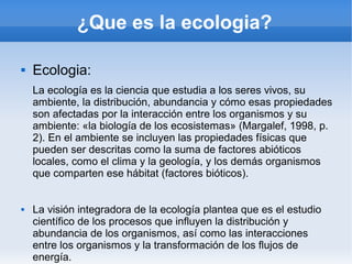 La ecología estudia las interacciones entre organismos y su ambiente, incluyendo factores abióticos como el clima y factores bióticos como las relaciones entre organismos. Examina conceptos como cadenas tróficas, flujos de energía, tasas de renovación, y ecosistemas. La ecología cultural estudia las relaciones entre sociedades humanas y sus ecosistemas.