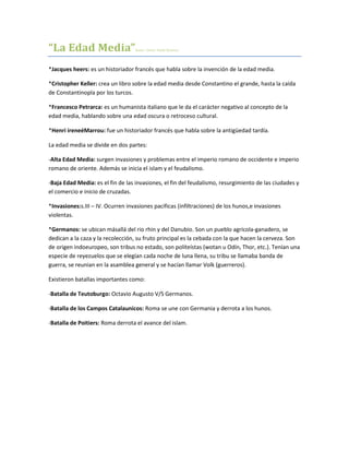 Este documento resume la Edad Media, incluyendo las invasiones bárbaras, el surgimiento del feudalismo, el cristianismo y el islam. Describe las dinastías merovingia y carolingia en el reino franco y el Imperio Carolingio. También analiza el Imperio Bizantino, las cruzadas, el papado y el surgimiento del Sacro Imperio Romano Germánico. Cubre temas como las lenguas romances, el derecho, la religión y las batallas importantes durante este período.