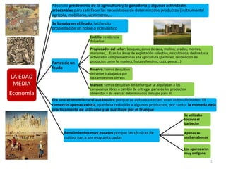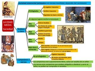 La Edad Media se caracterizó por una economía rural basada en el feudalismo y la agricultura de subsistencia, una sociedad estamental rígida dominada por la nobleza y el clero, y un poder político fragmentado entre los monarcas y los señores feudales. La religión católica ejercía una gran influencia en todos los aspectos de la vida a través de la jerarquía eclesiástica, los diezmos, las peregrinaciones, y la Inquisición para combatir las herejías.