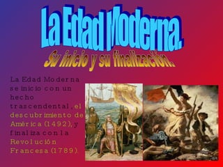 El documento resume los principales eventos y cambios durante la Edad Moderna, la cual comenzó con el descubrimiento de América en 1492 y terminó con la Revolución Francesa en 1789. Durante este periodo, los reyes europeos aumentaron su poder centralizando la autoridad, hubo grandes avances científicos como la brújula que facilitaron la exploración, y creció el comercio entre España y sus colonias en América. También florecieron las ciudades, surgieron los movimientos protestantes y artísticos como el Ren