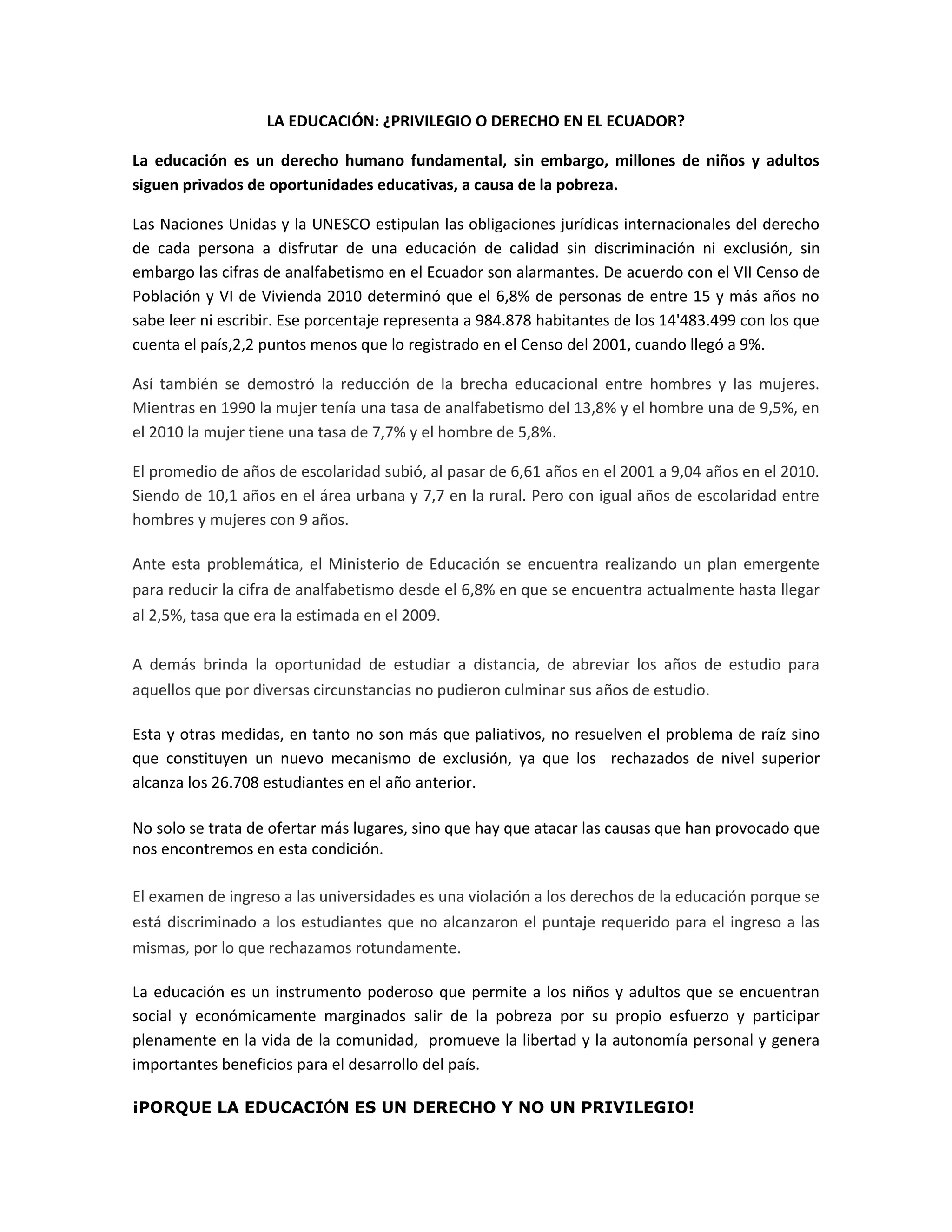 El documento discute si la educación es un derecho o un privilegio en Ecuador. A pesar de que las Naciones Unidas han establecido que la educación es un derecho humano fundamental, muchas personas en Ecuador aún no tienen acceso a una educación de calidad debido a la pobreza y la discriminación. Si bien Ecuador ha reducido las tasas de analfabetismo y ampliado la escolaridad promedio en los últimos años, todavía queda mucho por hacer para garantizar que todos los ecuatorianos puedan ejercer su derecho a la educación.