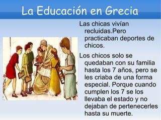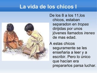 La educación en la antigua Grecia separaba a los niños de sus familias a una edad temprana, sometiéndolos a un régimen estricto dirigido por el estado. Las niñas se quedaban en casa mientras que los niños eran entrenados física y militarmente desde los 7 años de edad. Entre los 8 y 11 años, los niños vivían en grupos dirigidos por jóvenes mayores y recibían instrucción básica en lectura y escritura con el objetivo de prepararlos para la batalla. A partir de los