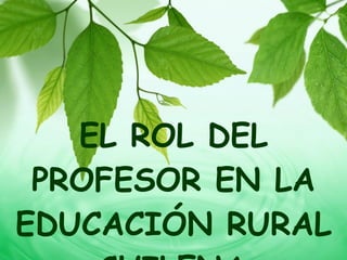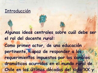 El documento describe el rol del profesor en la educación rural chilena. Explica que la educación rural no ha podido responder a los cambios en el mundo rural debido a la globalización. También señala que los currículos escolares ignoran los saberes locales y que los profesores rurales enfrentan desafíos como falta de capacitación y recursos tecnológicos. Finalmente, propone que el profesor rural debe ser un guía para los estudiantes, un articulador con la comunidad, y un conocedor de la diversidad de intereses de sus estudiant