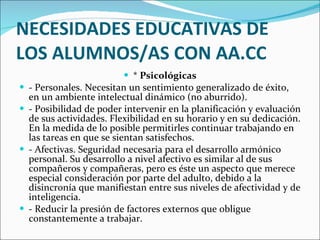 El documento describe las necesidades educativas de los estudiantes con altas capacidades en tres áreas: psicológicas, sociales e intelectuales. Psicológicamente necesitan sentirse exitosos y tener flexibilidad. Socialmente necesitan sentirse aceptados. Intelectualmente necesitan enseñanza individualizada, acceso a recursos adicionales y oportunidades para desarrollar su creatividad. El currículo debe adaptarse para satisfacer estas necesidades a través de métodos como el aprendizaje autónomo y la resolución creativa de problemas.