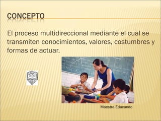 El documento discute los diferentes tipos de educación, incluyendo la educación formal que ocurre en escuelas e instituciones, la educación no formal que incluye cursos y academias, y la educación informal que se adquiere a lo largo de la vida y abarca los otros dos tipos. El documento también menciona que la educación es el proceso mediante el cual se transmiten conocimientos, valores y costumbres.