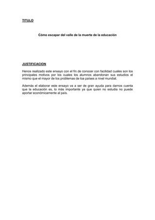 A nivel mundial, la educación es muy importante para el desarrollo de los países y sus ciudadanos. Sin embargo, existe un alto índice de abandono escolar, especialmente en comunidades indígenas y desfavorecidas. El documento argumenta que si los maestros utilizaran metodologías más motivadoras que enfatizaran valores en lugar de solo contenido, y si fomentaran la participación de los estudiantes, menos alumnos abandonarían la escuela. También resalta la importancia de que los maestros estimulen el aprendizaje y la