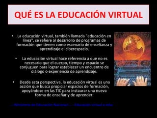 El documento describe la educación virtual como una forma de educación apoyada en las tecnologías de la información y la comunicación que permite que el aprendizaje ocurra sin que el profesor y el estudiante estén en el mismo lugar físico. Explica que la educación virtual utiliza diversos materiales como videos, sonido e imágenes para facilitar el aprendizaje de manera autodidacta y flexible en cuanto al espacio y el tiempo. También señala que tanto la educación virtual como la educación a distancia buscan complementarse para brindar formación apoy